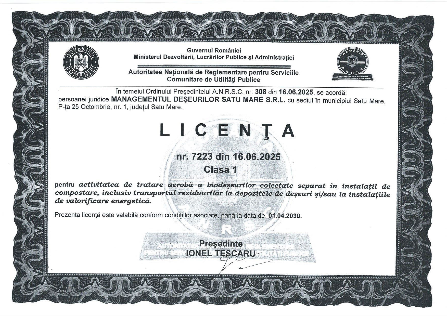 Licenta ANRSC Clasa 1 nr.7223 din 16.06.2025 pentru tratare aeroba a biodeseurilor